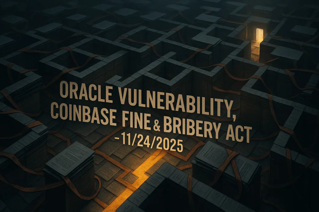 This compliance digest highlights critical vulnerabilities impacting healthcare and financial sectors, alongside significant regulatory updates. Oracle Identity Manager and Emerson Appleton UPSMON-PRO both face active exploitation of critical flaws, demanding immediate attention. Coinbase is hit with a substantial fine from the Central Bank of Ireland for AML compliance failures. Also, a landmark conviction under the Bribery Act in the UK serves as a stark reminder of anti-corruption obligations.